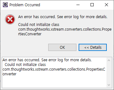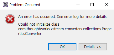An error has occurred. See error log for more details. Could not initialize class com.thoughtworks.xstream.converters.collections.PropertiesConverter