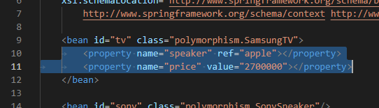 setter 인젝션을 사용하려면 property 엘리먼트를 사용해야하며 name 속성값이 호출하고자하는 메소드 이름이다.