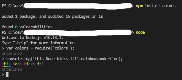 테스트 삼아 npm 의 coleors 모듈을 설치하고 실행하여 확인을 해보겠습니다.