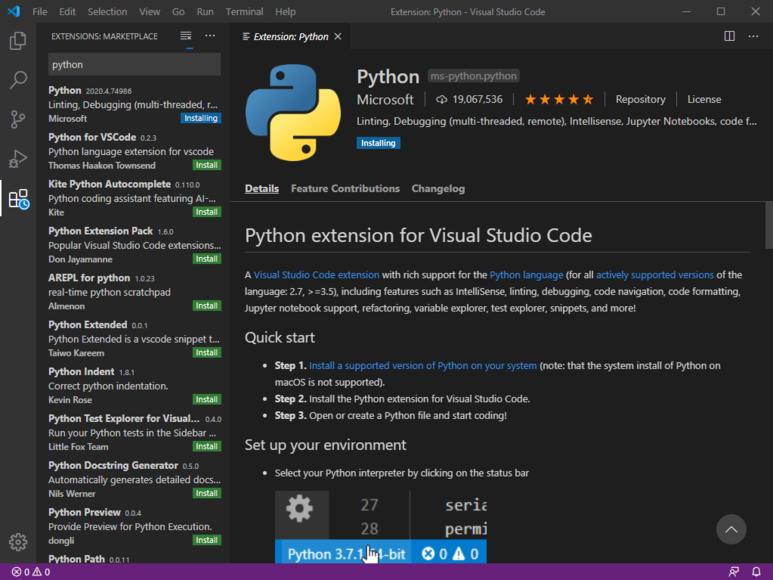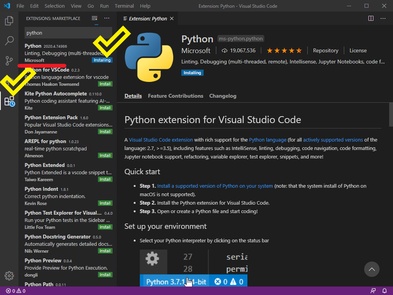 왼쪽 프레임바 사각형(확장프로그램마켓) > python 검색후 microsoft 의 확장프로그램 install> 기다리기