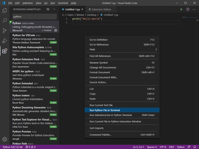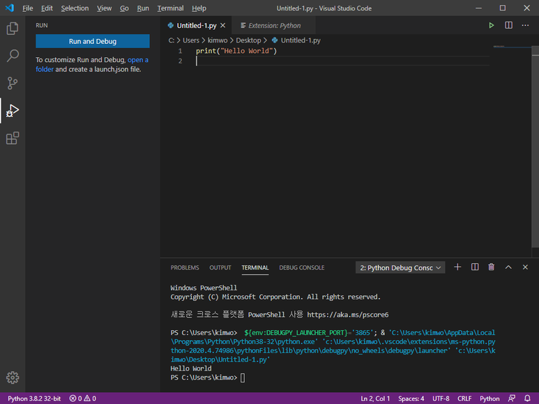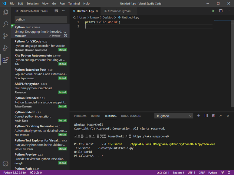 파이썬. 비주얼스튜디오코드로 사용하기. Python. VS CODE로 사용해보기. 개발환경 구축 후 확인하기