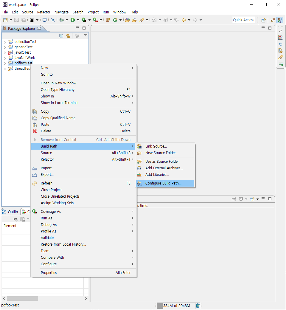 1. 적용할 프로젝트 마우스 오른쪽 클릭 >> Build Path >> Configure Build path 클릭.